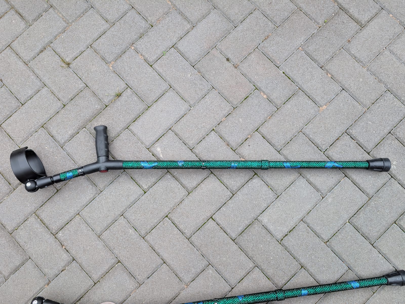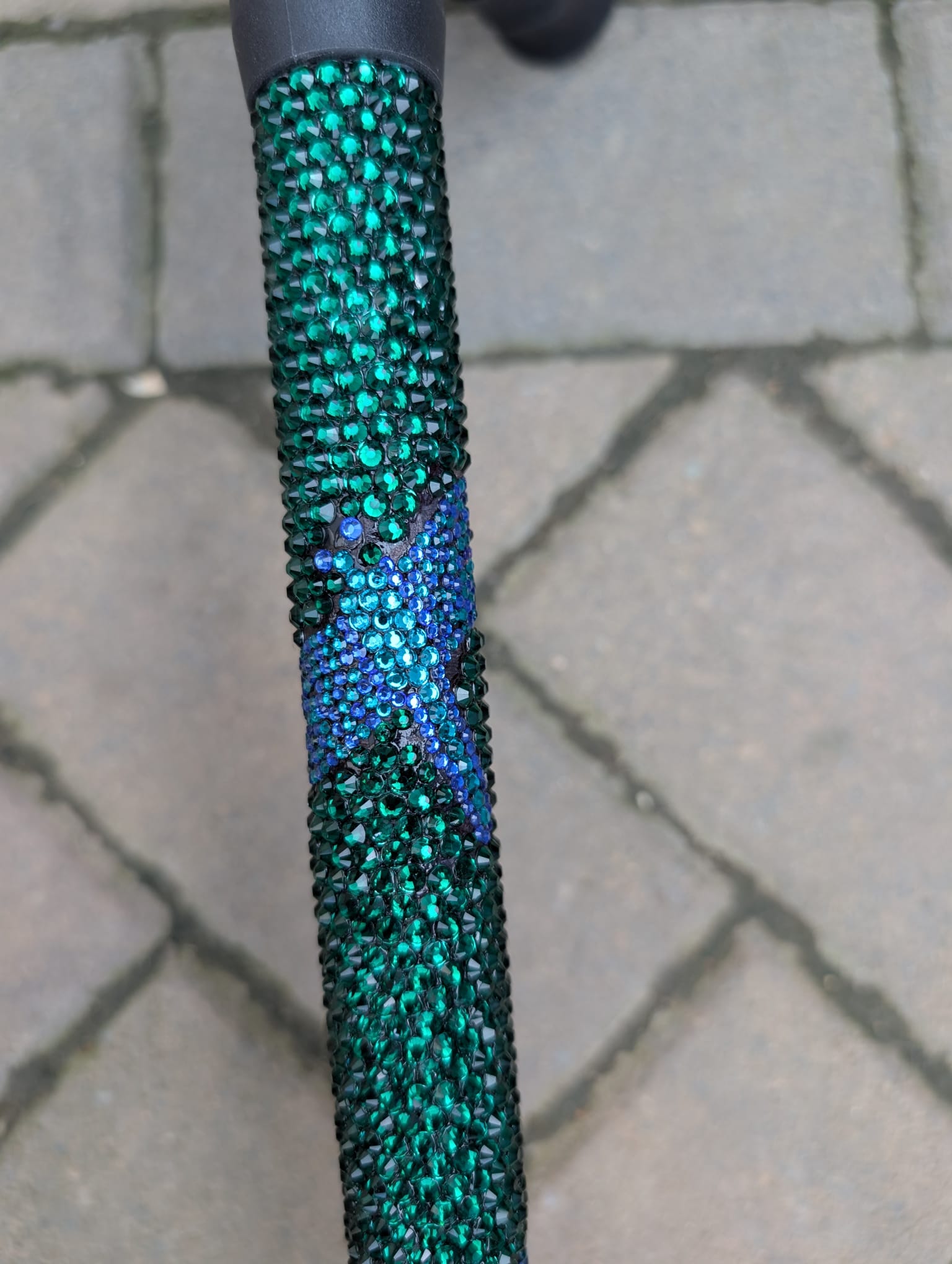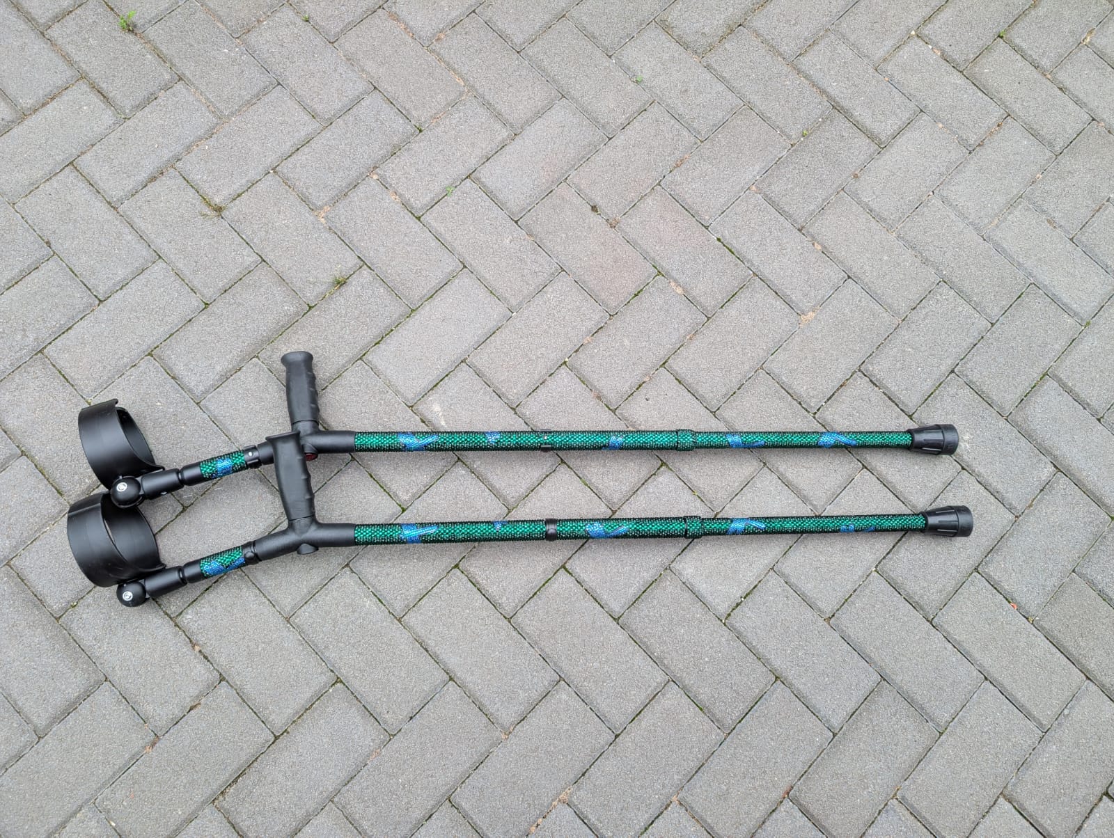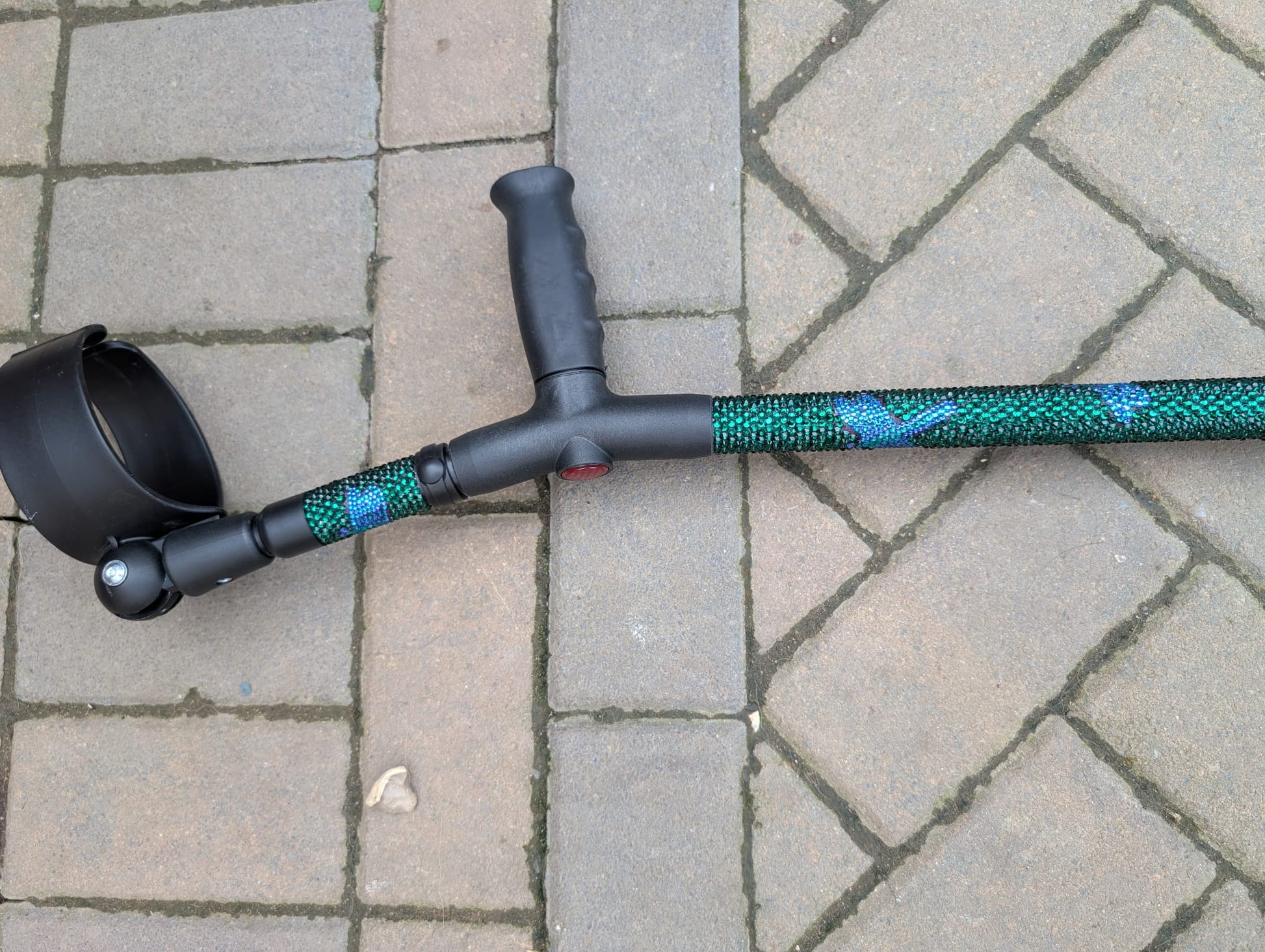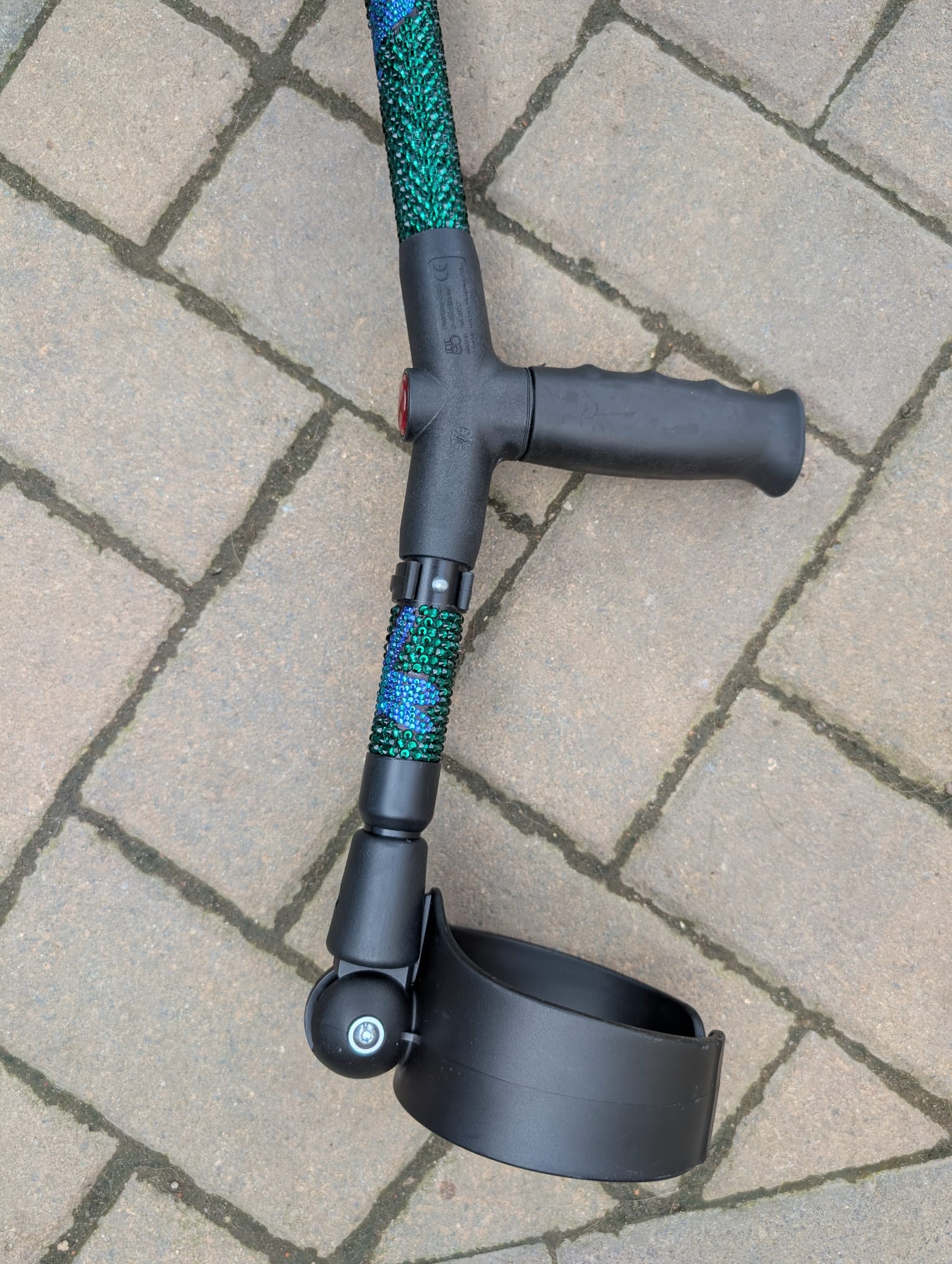 This pair of crutches has beautiful dragon fly details in blue rhinestones surrounded by elegany emerald green Rhinestones cover the full length of the crutch. They are available now in 35" but can made shorter if required