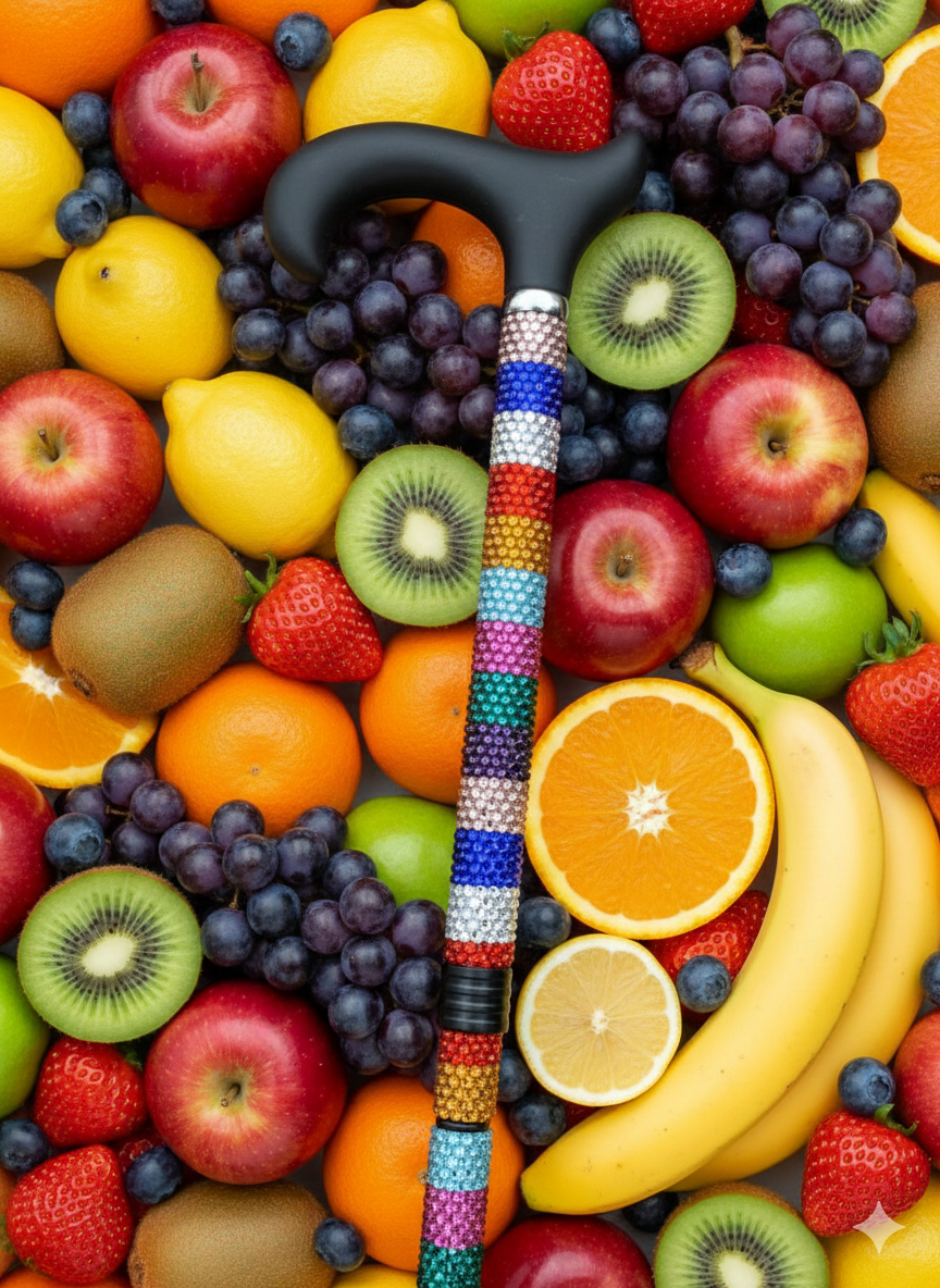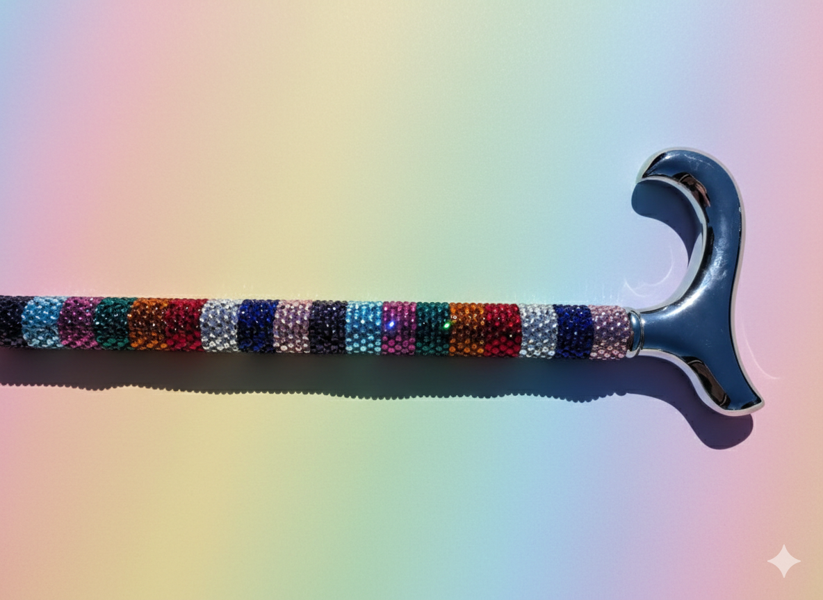 A stunning and elegant walking stick covered in a breathtaking 2500 sparkling Rhinestones in 9 different colours, enough to make your day shine, whatever the mood or weather!