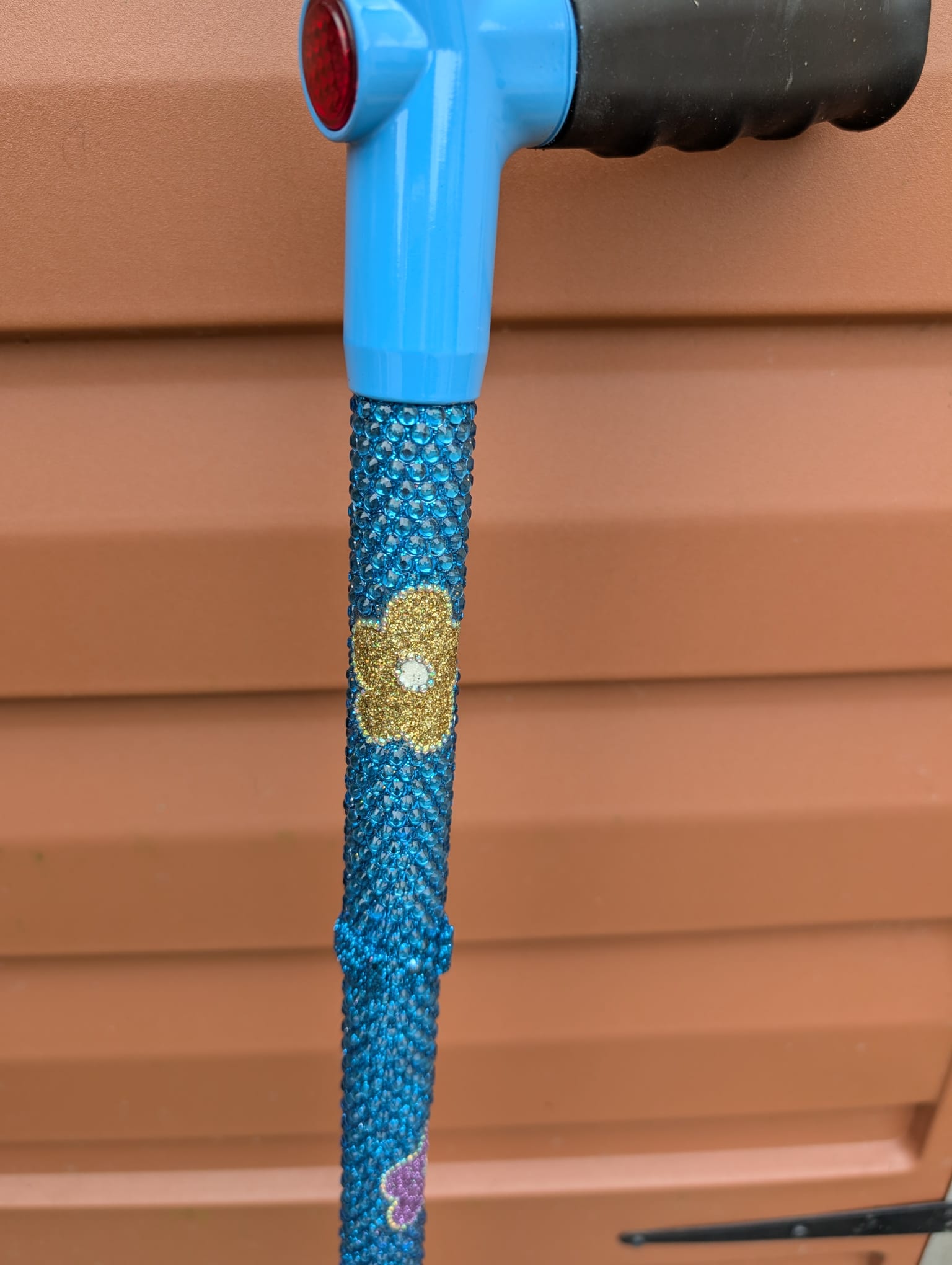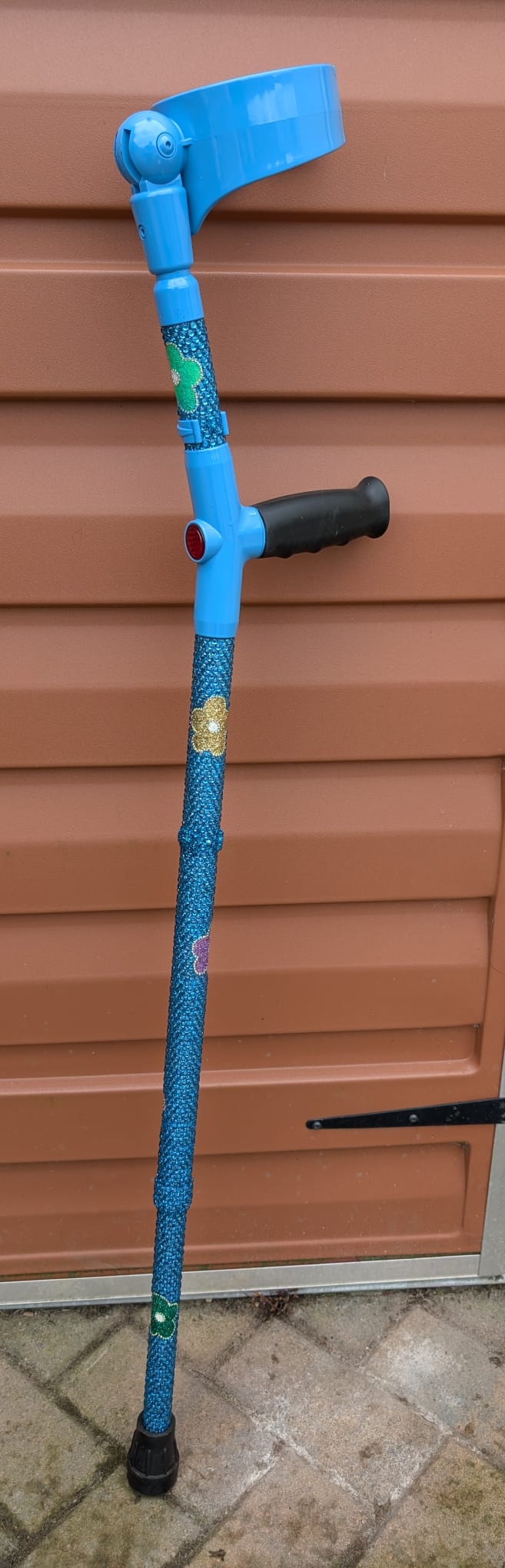 The crutch in question is a vibrant and whimsical piece, painted in a soothing sky blue that evokes a sense of calm and cheerfulness. The base colour serves as a perfect backdrop for its delightful floral design. Sprinkled across the crutch are intricately crafted flowers, each made of sparkling glitter in various shades of blue, white, and perhaps a hint of pink. These flowers add a playful and artistic flair, making the crutch not just a mobility aid but also a charming accessory.