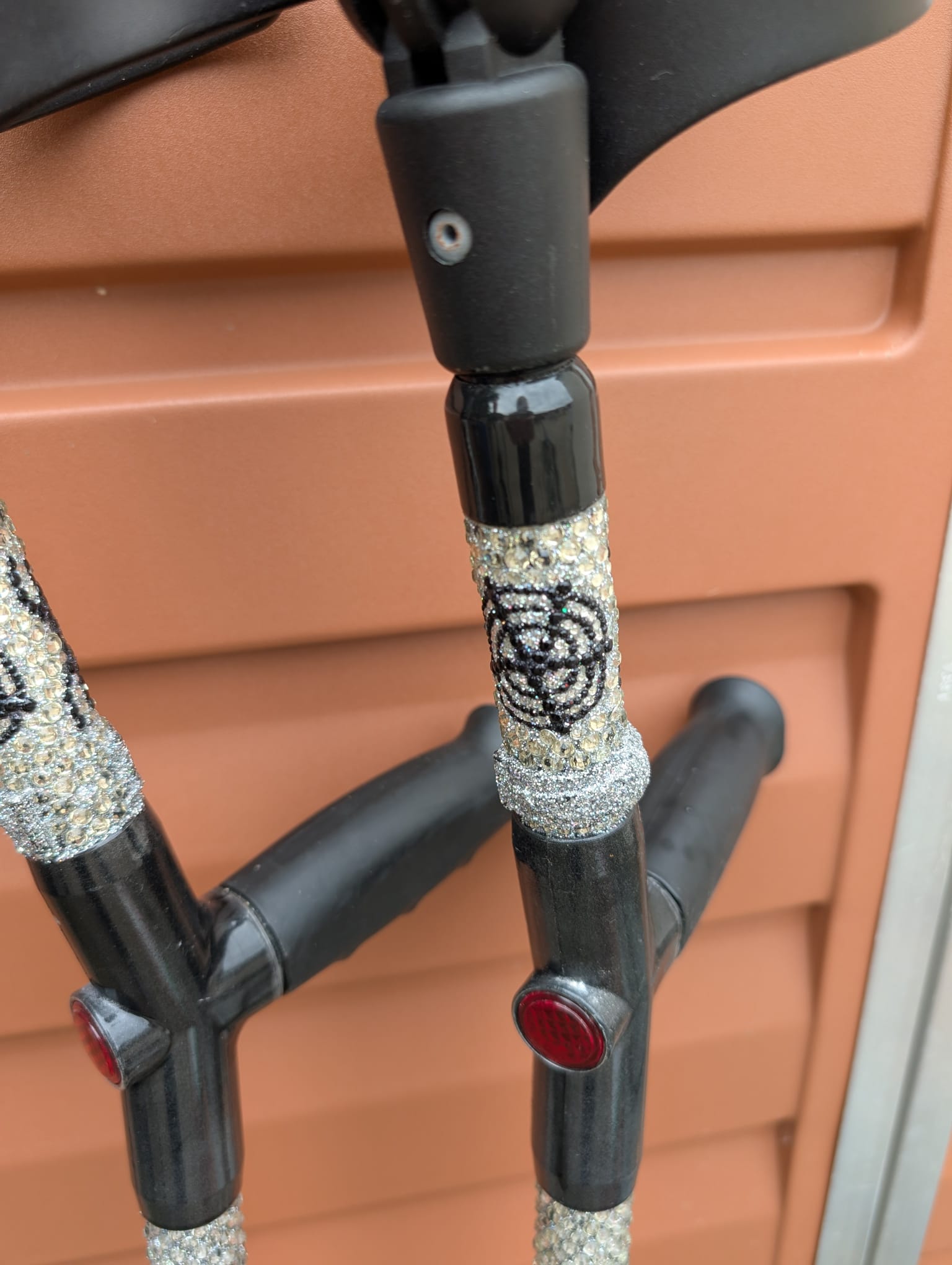 Imagine a crutch that showcases a unique and eye-catching design inspired by a spider theme. The crutch is primarily crafted from a sturdy, lightweight material, ensuring both durability and comfort. The standout feature of this crutch is the detailed spider design, intricately embellished with sparkling black rhinestones that create the shape of a spider, complete with its distinctive legs and body.